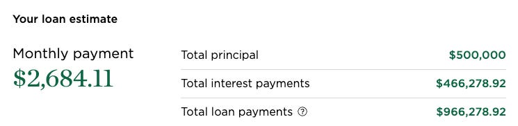 Let’s take an example to drive this point across if you buy a house that costs half a million dollars with a 30-year mortgage for a 5% interest rate which is generous as the interest rates are around 8% for homes currently. This is how much you would end up paying.